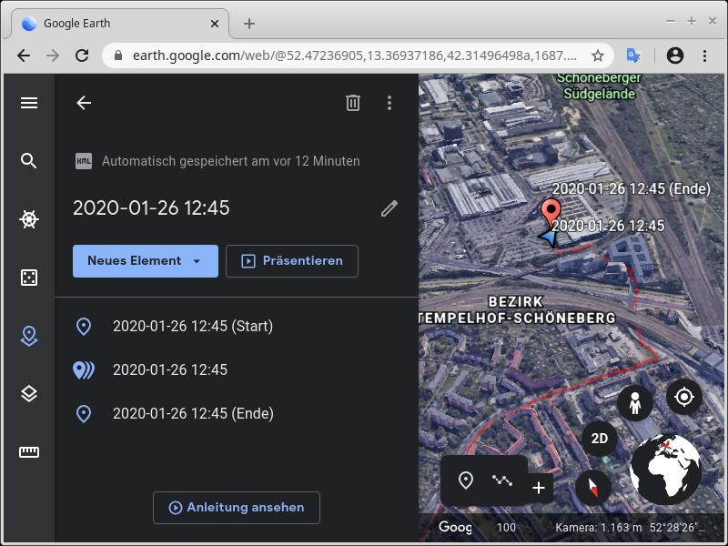 Die aufgezeichnete KML-Datei ist ein Spaziergang zu einem Möbelhaus in Berlin. Exportiert als KML auf einen USB-Stick und importiert in Google Earth Web via Projekte → Neues Element → von Datei öffnen. Hier sichtbar als rote Linie bis zum Endpunkt.