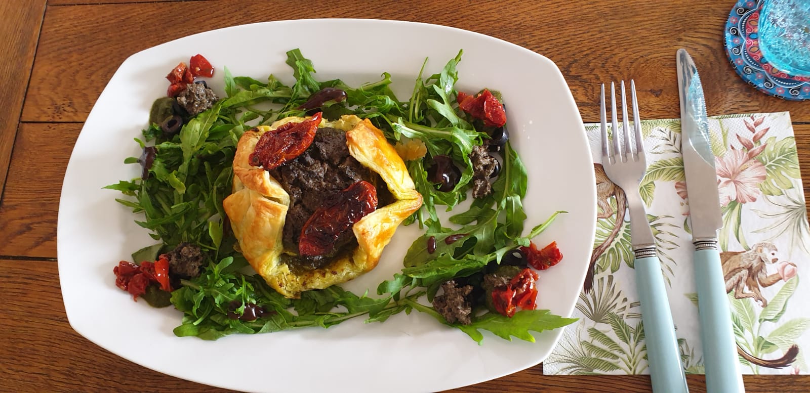 Die Blätterteigquadrate nebeneinander legen, darauf 2 getrocknete Tomaten mittig legen, den Ziegenkäse beidseitig mit Tapenade und Pesto bestreichen (nicht zu knapp