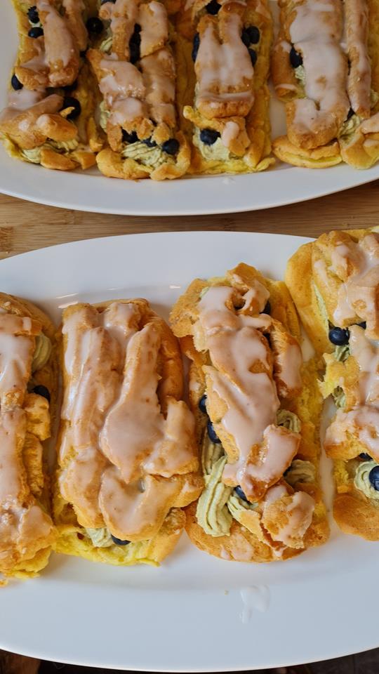 Für die Füllung Mascarpone und Pistaziencreme mit den Quirlen des Handrührers kurz verrühren und in einen Spritzbeutel mit kleiner Lochtülle füllen. 15 Minuten kaltstellen. Pistaziencreme auf die Unterseiten der Eclairs spritzen. Blaubeeren darauf verteilen und leicht andrücken. Sofort servieren steht im Rezept. Kann man so machen, man kann aber auch die Eclairs erst in den Kühlschrank stellen (wohin sie sowieso müssen bei Aufbewahrung) und dann verspeisen. Dann sind sie etwas weniger süss und schmecken meiner Ansicht nach noch besser...