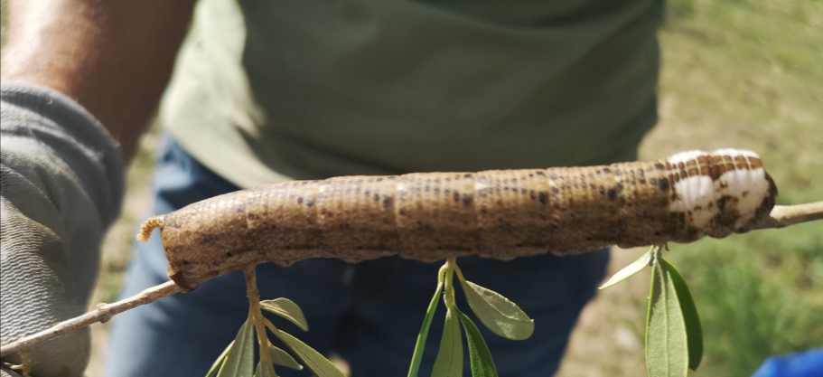 Bei der Ernte entdeckte ich gestern diese respekteinflößende Raupe in einem Olivenbaum. Sie sah aus wie die Verdickung eines Zweiges.