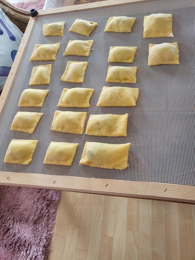 Teig noch einmal durchkneten und in Portionen teilen. Mit dem Nudelholz oder der Nudelmaschine zu dünnen Platten ausrollen. Die Hälfte davon im Abstand von 4 cm mit 1 TL Füllung belegen. Die übrigen Platten darüber klappen und zwischen der Füllung andrücken. Mit einem Teigrädchen Ravioli ausschneiden. Im Buch steht auf Küchentücher legen und eventuell etwas trocknen lassen. Ich habe mir dafür ein Gestell besorgt auf dem die Ravioli trocknen können.