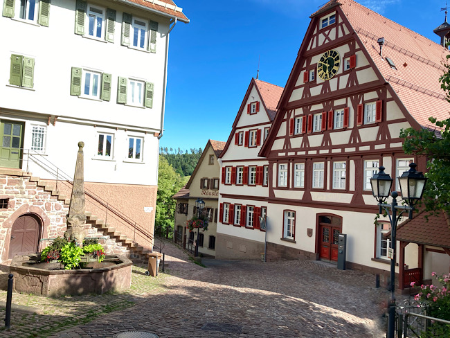 Herrlich war der Anblick der hoch über der Nagold liegenden Altstadt von Altensteig und es wundert uns nicht, dass die unter Denkmalschutz stehende Fachwerk-Gruppe aus dem 15. bis 18. Jh in fast jedem Bildband Baden-Württembergs zu finden ist.