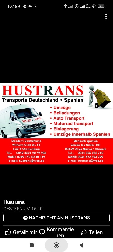 Vorsicht! Es sind da besonders an der Costa Blanca Zeitgeister unterwegs, die selbst keine Fahrzeuge haben und nur vermiiteln, aber kräftig abkassieren. Sobald Vorauszahlungen verlangt werden Finger weg. Seriöse Unternehmen rechnen ab, wenn die Leistungen erbracht sind. Die Fa. Zitzelsberger in Regensburg fährt regelmäßig und nach meinen Erfahrungen zuverlässig.