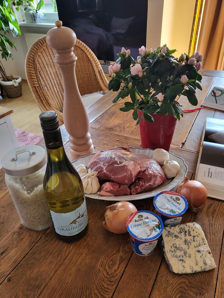 Roquefort mit 200 g Creme Fraiche glattrühren. Die Keule nach 10 Minuten so drehen, daß die gewölbte Seite nach unten liegt, dann mit der Käsecreme bestreichen...