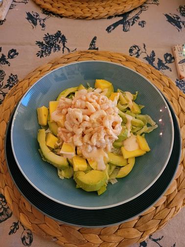 die Gambas am Morgen im Kühlschrank auftauen. Den Eisbergsalat in Streifen schneiden. Auf einem tiefen Teller anrichten: 1 Lage Eisbergsalat, in Streifen geschnittene Avocado, kleine Stückchen Ananas obendrauf. Die Majonaise mit einem Eigelb und einem Teelöffel Dijonsenf unter langsamen Hinzufügen von Rapsöl mit einem Schneebesen schlagen bis sie dick ist, dann Salz, eine Portion Yoghurt und genügend Ketchup, sowie Ananassaft hinzufügen. Björn Freitag nimmt noch Brandy dazu..... dann nach Belieben Chiliflocken dazu....