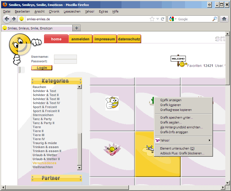 bei www.smilies-smilies.de musst du zuerst den gewünschten Smiley mit links anklicken, dann geht ein neues Fenster mit der weiteren Vorgehensweise auf und dann kommt die rechte Maustaste zum Einsatz.