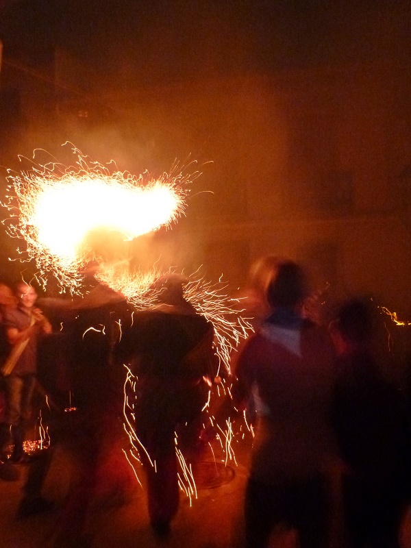 Bei der Fiesta am Wochenende in Jalón fand auch ein Correfoc statt. Da er nicht wie sonst üblich nachts um 2 Uhr, sondern schon um 22 Uhr angesetzt war, machte ich mich auf die Socken, um auch mal mittendrin zu stecken.