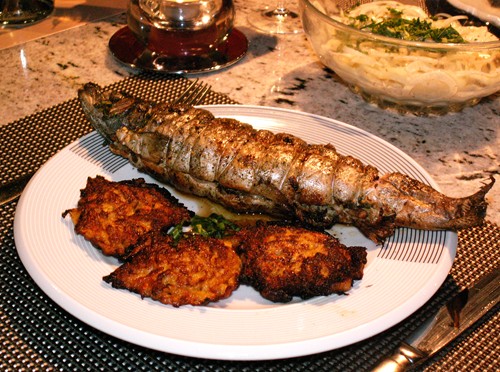 Zur Forelle gab es Rösti-Plätzchen. Einfacher und schneller sind natürlich Salzkartoffeln aus der Boullion zu bereitet. Ein Fenchelsalat rundete das Essen ab und das Fischchen dürfte in einem kühlen Weissen "baden".