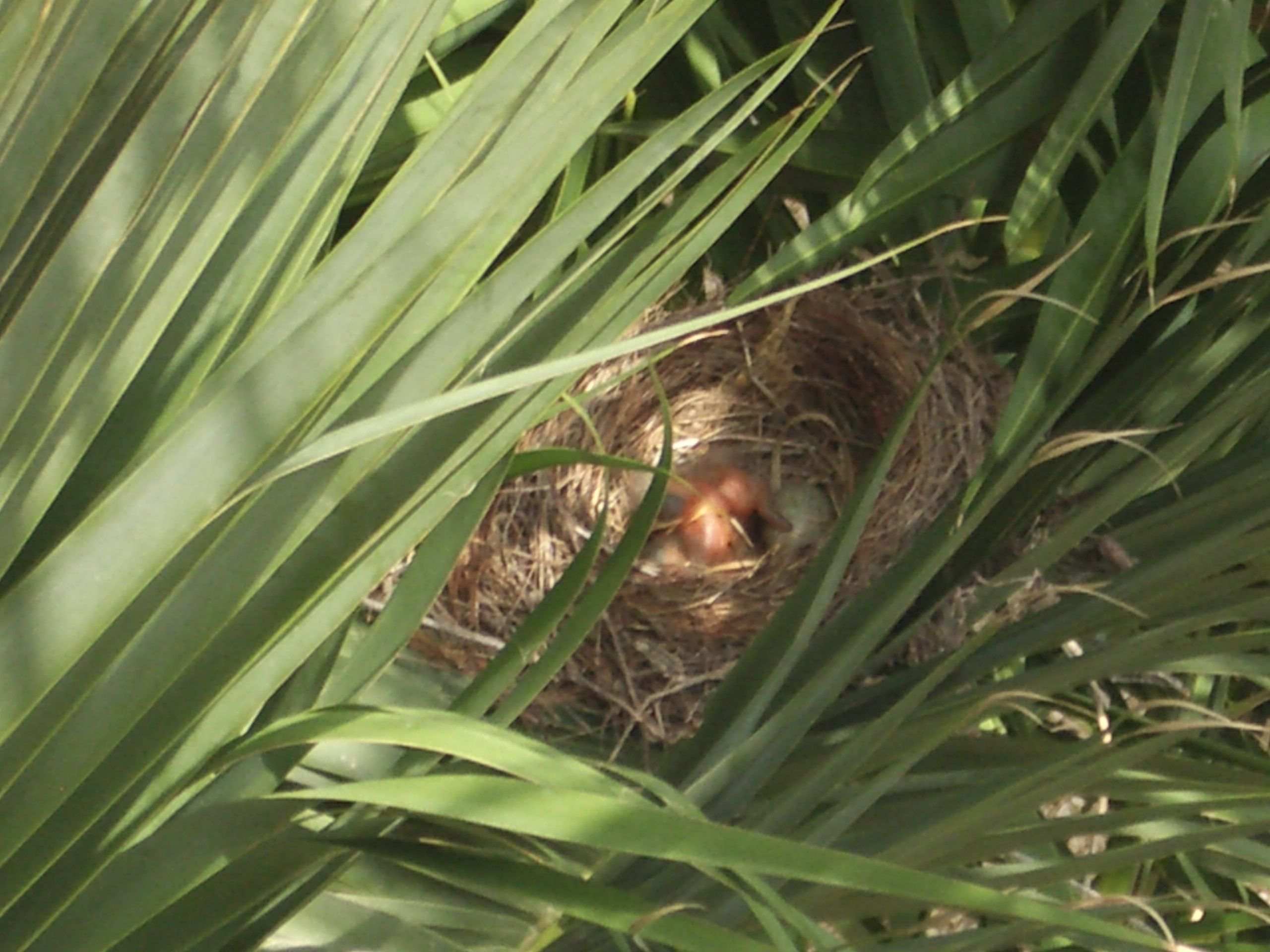 In unserem Garten hat sich eine Drossel zufällig einen Platz für ihr Nest in einer Palme ausgesucht, der von einer Treppe aus gut von oben einzusehen ist. Wir haben es erst entdeckt, als es fertig war, aber es war zunächst noch leer; wir dachten zuerst, es wäre ein altes, verlassenes. Dann lag auf einmal ein Ei drin, dann nach und nach weitere, dann saß irgendwann die Drossel drauf und die Brutzeit begann. Näher dranzugehen für ein Foto, oder auch nur länger hinzuschauen, ist problematisch, der Vogel reagiert sofort nervös.