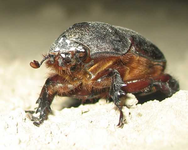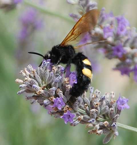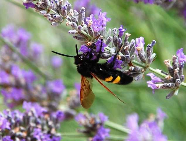 Dies scheint also eine "Rotstirnige Dolchwespe" zu sein. Warum sie so heißt? Keine Ahnung! Das Köpfchen des Weibchens ist an der Vorderseite gelb gefärbt, während das der Männchen völlig schwarz ist. Ihr wissenschaftlicher Name ist Megascolia (Regiscolia) maculata flavifrons. auf Spanisch heißt sie „Avispa parasita de cuatro puntos“ (u.a. weil das Weibchen am Hinterleib vier gelbe Flecken hat). Die englische Bezeichnung „Mammoth Wasp“ sagt etwas über ihre enorme Größe aus (Dolchwespen gehören mit einer Länge bis zu 60 mm zu den größten Hautflüglern Europas). Das Weibchen der Rotstirnigen Dolchwespe kann bis zu 50 mm lang werden und hat am Hinterleib vier gelbe Punkte und einen Giftstachel am letzten Segment, die kleineren Männchen hingegen zwei gelbe Bänder (Warnfarbe). Man kann die Insekten zwischen Mai und August beobachten, sie ernähren sich von Nektar. Der spanische Name sagt, dass es sich um eine parasitäre Wespe handelt, denn das Weibchen bedient sich der Engerlinge von Nashorn- oder Hirschkäfern (beide in Spanien heimisch), um ihre Eier in die Larven zu legen. Die paralysierte Larve dient der Wespenbrut als Nahrungsdepot.
