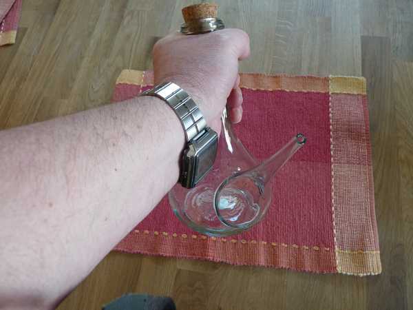 Es gibt im Prinzip 3 naheliegende Möglichkeiten den Porrón fest zu halten.