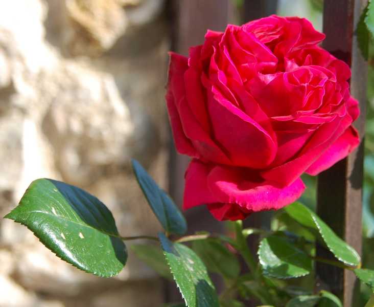 Die Blüten der Red Eden Rose erinnern an alte Rosen: sie sind purpurrot, duften nach Moschus - besonders in der Mittagszeit. Die Rose ist winterhart (bis 29 ° C) und blüht in Spanien ab April bis zum Einsetzen des Frostes (in Mitteleuropa). Bei mir im Hinterland hat sie im Winter nur kurzzeitig alle Blätter verloren.