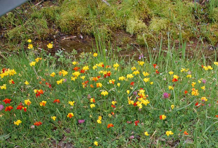 Hier auf den Höhen dominierte schon niedriges Gebüsch. Wacholder, duftender blühender Ginster und Farne. Dazwischen das Weidevieh auf üppigen Wiesen.