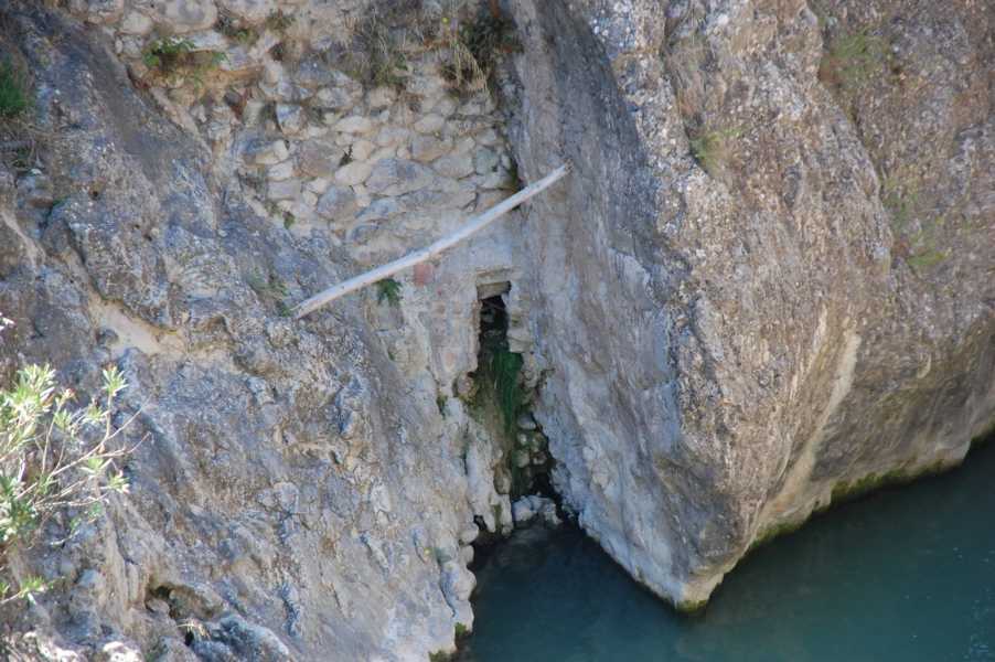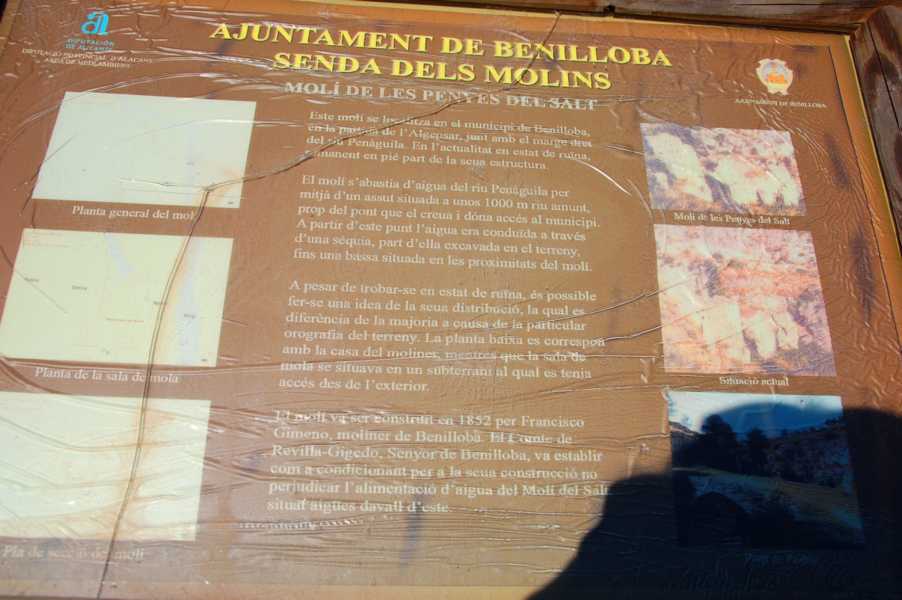 Leider hat die Sonne schon einen Teil der Hinweisschilder unlesbar gemacht. Wir blicken hinab in eine enge Schlucht, durch die sich der Wildbach Penáguila durch die Felsen presst. Die historische Molí de Les Penyes del Salt, von der nur noch ein paar Grundmauern übriggeblieben sind, wurde im Jahr 1852 erbaut. In ihr wurde Getreide gemahlen.