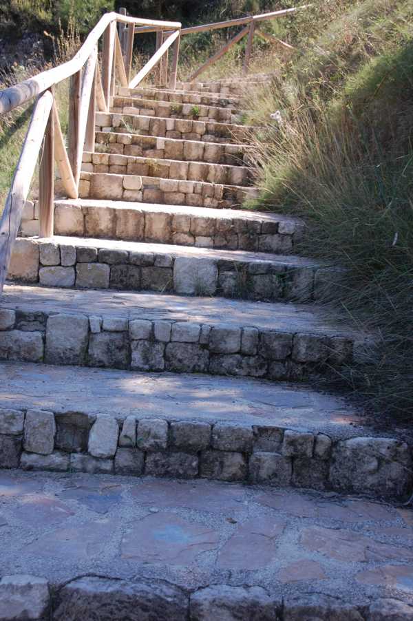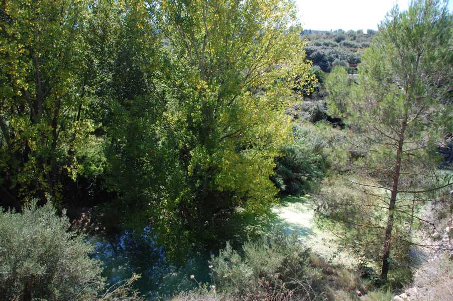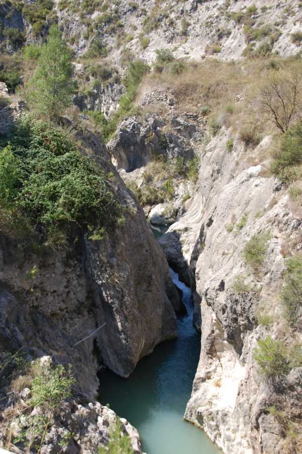 Kurz danach überqueren wir eine alte Steinbrücke aus der Maurenzeit, von der man auf den Wildbach mit seinen kleinen Wasserfällen, Mäandern und kleinen Becken hinabschaut, der nun auf der rechten Seite des Weges entlang fließt. Auch im weiteren Verlauf des Weges, der uns durch verwilderte Olivenplantagen führt, können wir aus der Höhe immer wieder bis hinunter auf den Grund der Schlucht blicken.