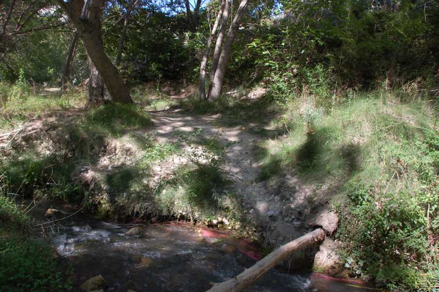- a) + b) ----> c) Die CV-70 führt durch Benilloba hindurch. Ca. 500 m nach dem Ortsausgang geht es rechts ab auf die CV-790 Richtung Cocentaina. Nach ungefähr 800 m geht in einer Kurve eine asphaltierte Straße rechts ab. Auch bei diesem Weg handelt es sich um die CV-790, man findet jedoch kein Hinweisschild. Der Weg führt ca. 600 m durch Olivenhainen bis hinunter zum Fluss, vor der Furt befindet sich linker Hand die Font de La Teulería, aus der frisches, kühles Wasser sprudelt. Nach der Überquerung des Flusses geht links ein etwas holperiger Weg hoch zu einem Parkplatz.